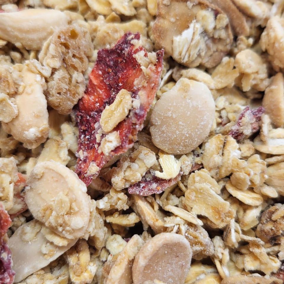 Copos de avena integrales sin gluten, chocolate blanco (29,2% cacao, azúcar, manteca de cacao, leche desnatada en polvo, materia grasa láctea, lecitina de soja/soya y aroma natural de vainilla), almendras Marconas, aceite de oliva virgen extra, fresas naturales deshidratadas, nueces de Macadamia, fibra soluble de Tapioca, azúcar moreno de caña y sal rosa del Himalaya. Alérgenos en negrita.