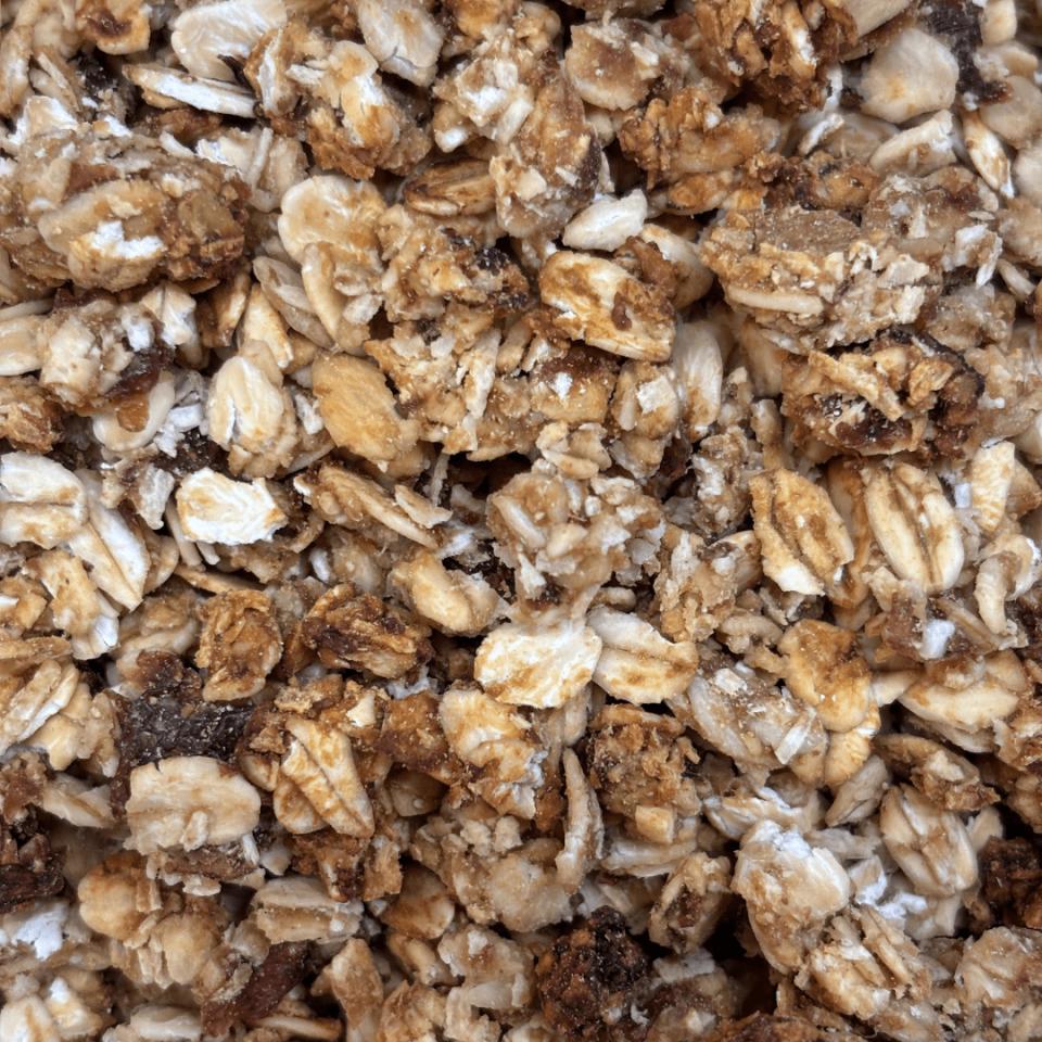 Copos de avena integrales, sirope natural de pasas, crema de cacahuete, coco rayado, sal rosa del Himalaya y jengibre La granola es una fuente de energía. La mejor manera de empezar el día, de coger fuerzas a media mañana o de prepararte para el entrenamiento vespertino.