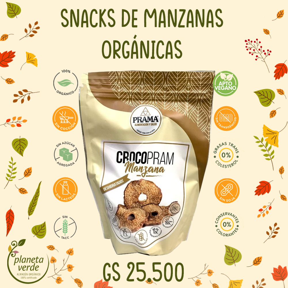 Elaboración con manzanas orgánicas de la huerta del centro depurativo, con coco orgánico que imita textura y forma de galletitas crujientes, en base al deshidratado de semillas procesadas, saborizadas y secadas en finas láminas. Ideal para consumir en todo momento, en viajes o entre horas.